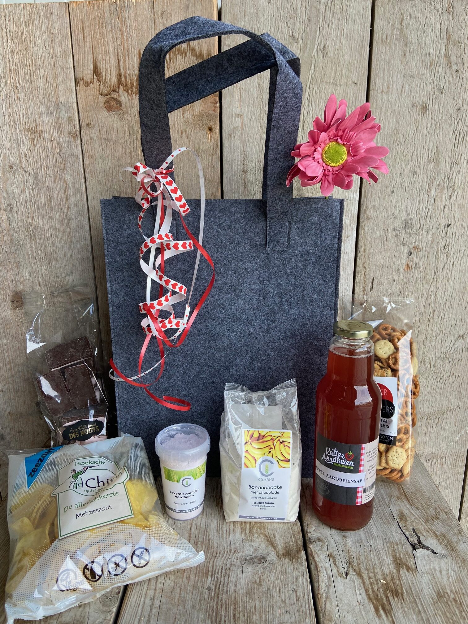 Een mooie tas van vilt, gevuld met heerlijke producten!